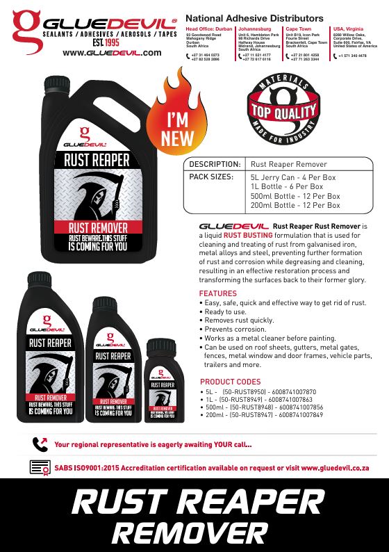 Previous Product Next Product Glue Devil Rust Remover 1L R115,00 Glue Devil Rust Remover 1L quantity Add to cart SKU: 50-RUST8949 Categories: Cleaning Liquid, Paints/Accessories Brand: GLUE DEVIL Additional information Additional information Weight 1,335 kg Dimensions 10 × 6 × 23 cm Related products Quick View Quick View Paints/Accessories, Spray PaintGlue Devil Cold Galv Spray Paint 300ml R76,08 Add to cart Quick View Quick View Cleaning Liquid, Paints/AccessoriesGlue Devil Rust Remover 5L R444,25 Add to cart Quick View Quick View Cleaning Liquid, Paints/AccessoriesGlue Devil Rust Reaper Converter & Primer 5lt R1468,46 Add to cart